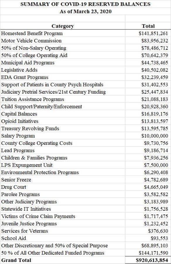 A full list of appropriation items that have been placed in reserve spending freeze includes: