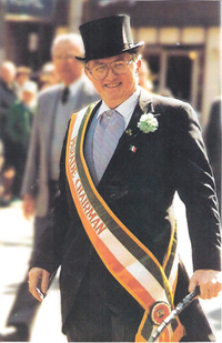 As bagpipes skirled, Kelly, trussed up in top hat and tails, would lean forward, usually against a biting March wind, and review the marchers and the bands.