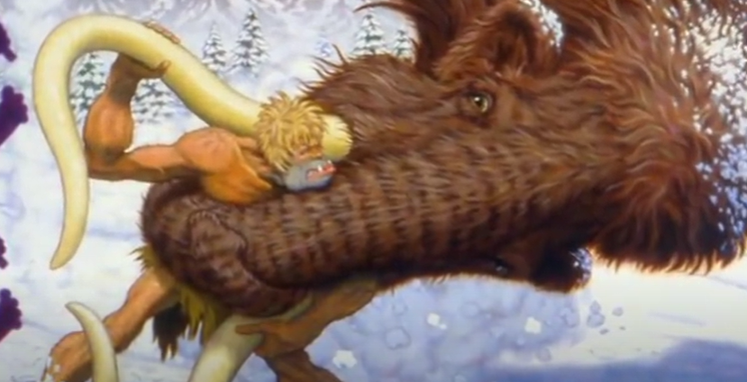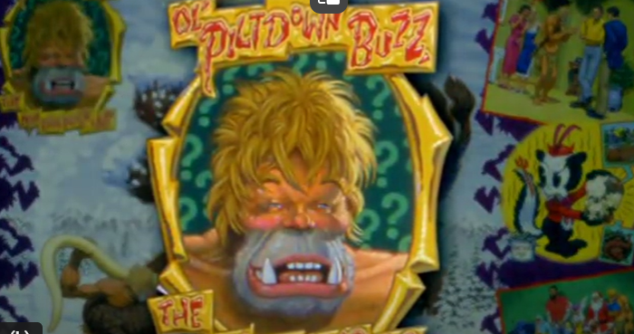 I know you can't understand, and so I'm trying to get hip, Johnson, to you and your ilk. I was looking at a painting of Piltdown Man the other day, and I got a little choked up, seeing him depicted running across the tundra in defense of a food source. Even the most primitive passages of our pre-history can inspire if we merely lower the bar and expunge history. Robert Williams, one of America's greatest artists, who painted the images you see here, also shows our hero Piltdown wrestling a mastodon into submission, in the process demonstrating his great physical strength. It's heady stuff, and no less moving really (or maybe more so, Johnson), without history, when one considers that Piltdown Man was a fraud, not the elusive missing link between ape and man, as originally purported, but an assemblage of bone parts, including orangutan teeth, somebody's disposable mandible, and scraps of a cranium.