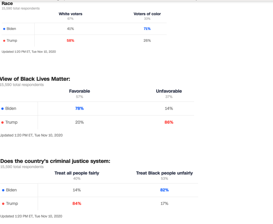 So, do these huge differences in voting preferences reflect a real difference in racial attitudes? Sure. Voters who have an unfavorable view of Black Lives Matter, broke overwhelmingly for Trump, 86-14%. Those who think the criminal justice system treats all people fairly–rather than treating Black people unfairly—broke overwhelmingly for Trump, 84-14%. Those who think racism in the U.S. is “not an important problem” broke for Trump by exactly the same margin, 84-14%.