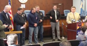 Two hundred cops, firefighters, and union leaders packed into the Atlantic City's council chambers in opposition to the latest round of proposed cutbacks by the state at a press conference that included AFL-CIO President Charlie Wowkanech, State PBA President Pat Colligan, Dom Marino of the International Firefighters, Bill DiLorenzo, President of the AC Firefighters Local 24. Mayor Guardian and Council members Tibbit, Small, and Gilliam were on hand as well in solidarity with the unions. A few hours earlier, on Harry Hurley's radio show, state emergency manager Jeff Chiesa had said lawsuits filed by the unions were nothing more than "simple money grabs" and that no one would show up to the press conference.