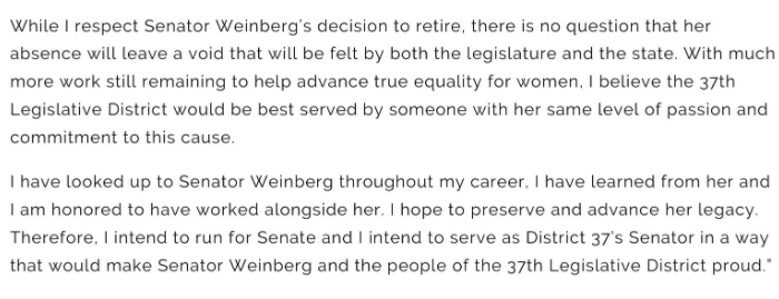 Therefore, I intend to run for Senate and I intend to serve as District 37’s Senator in a way that would make Senator Weinberg and the people of the 37th Legislative District proud.”