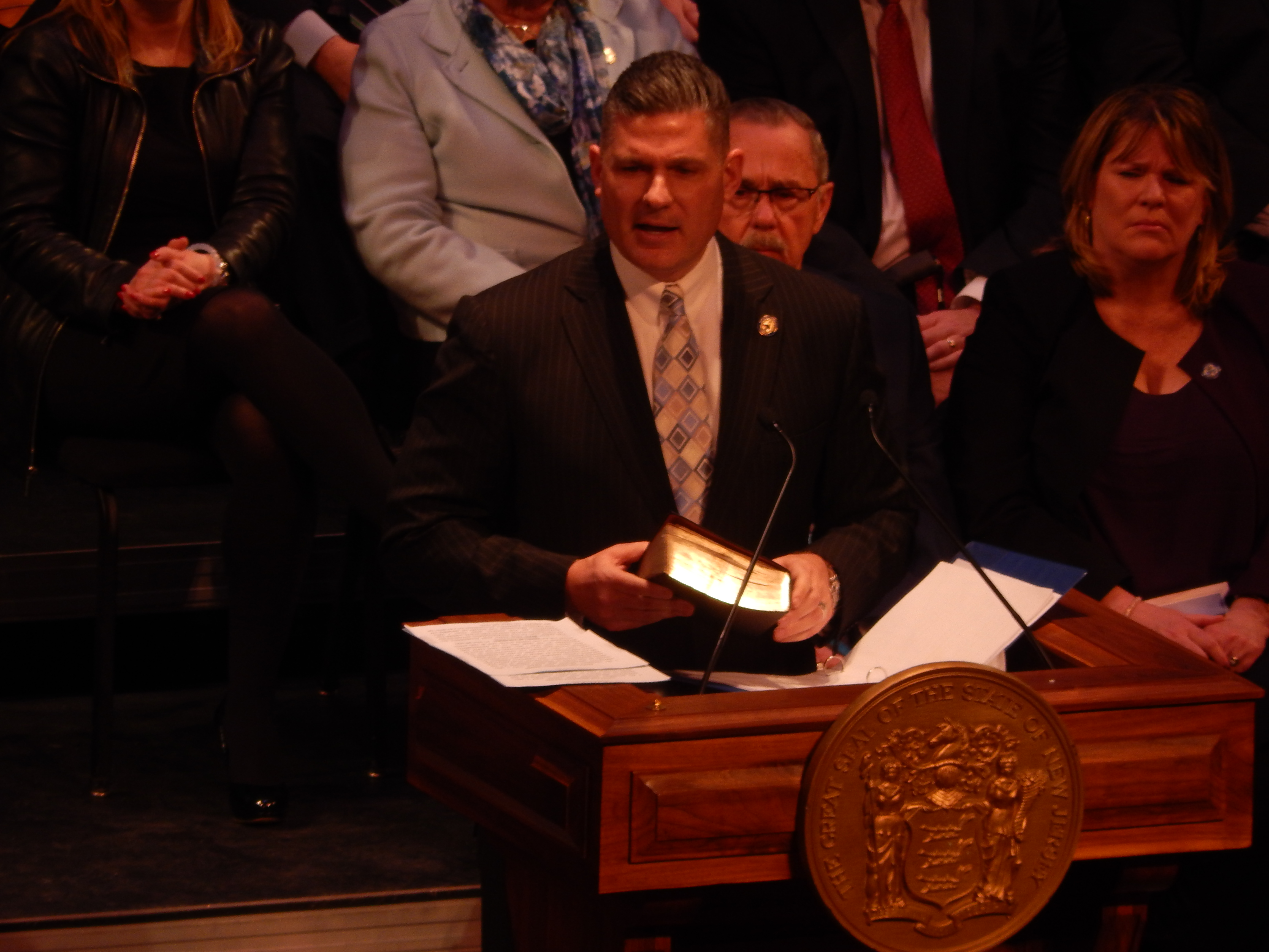 Assemblyman Roy Freiman (D-16) of Hillsborough assumes the oath of office.